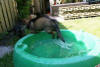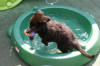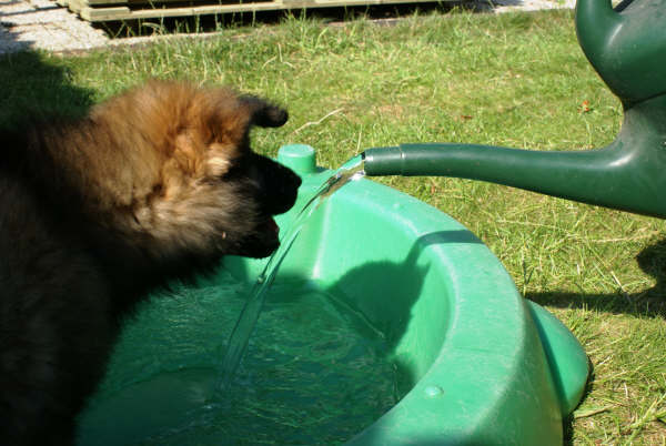 Volgende week hoop ik dat het wat minder warm is, je trekt er met deze temperaturen niet zo snel op uit, hij vindt het nog veel te warm, lekker koel op de tegelvloer binnen of tegen de buitenmuur van het huis liggen vindt hij heerlijk, en vooral met waterspelen is een favoriete bezigheid.